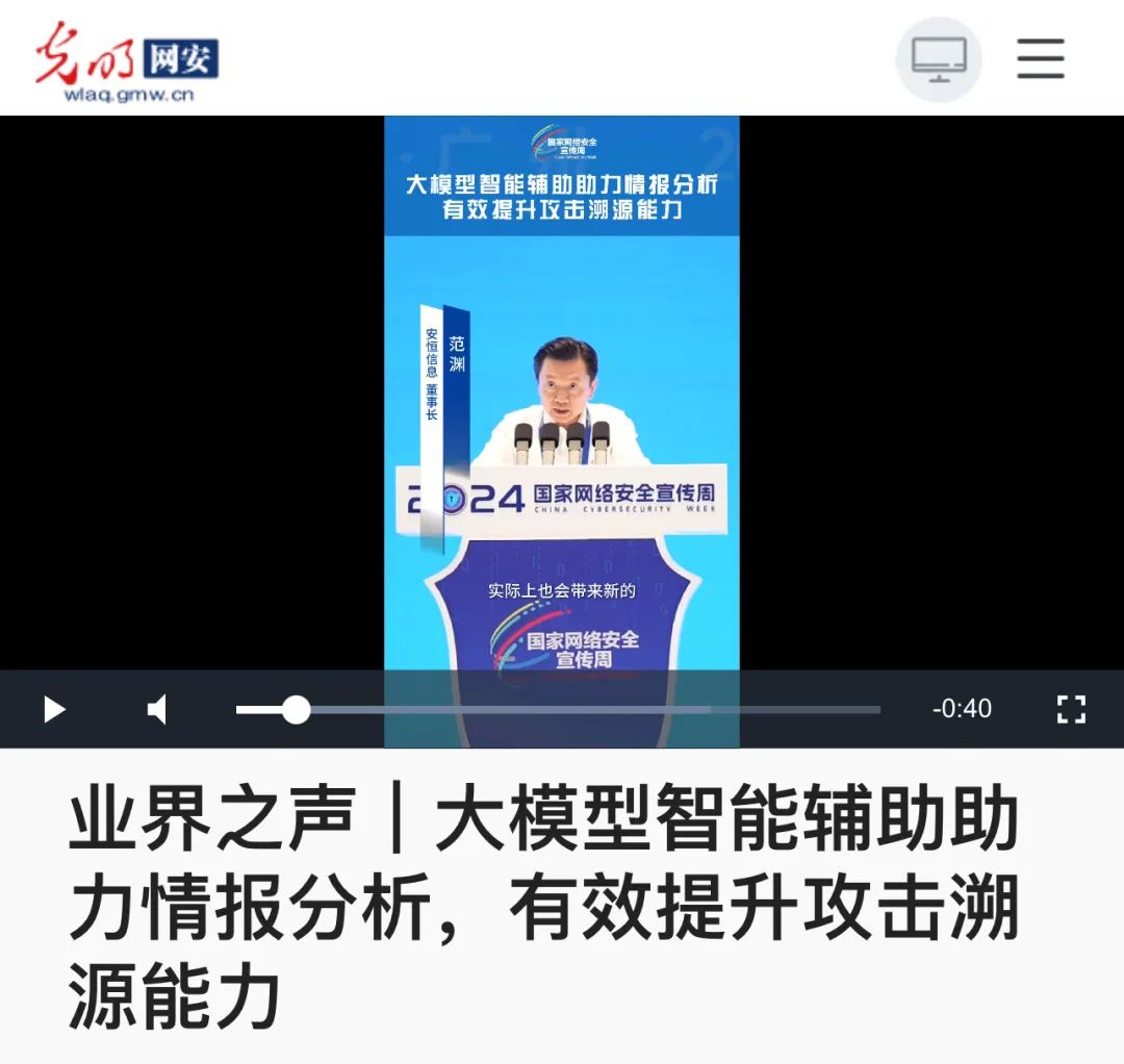 光明网、南方日报视频报道,2024网安周主论坛安恒信息董事长范渊发表演讲。