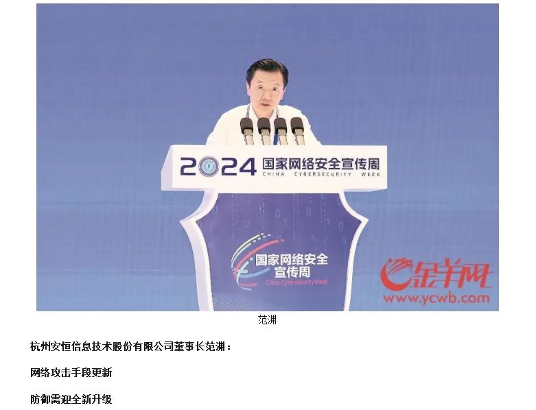 羊城晚报、新快报、南方都市报等媒体报道,2024网安周主论坛安恒信息董事长范渊演讲观点。