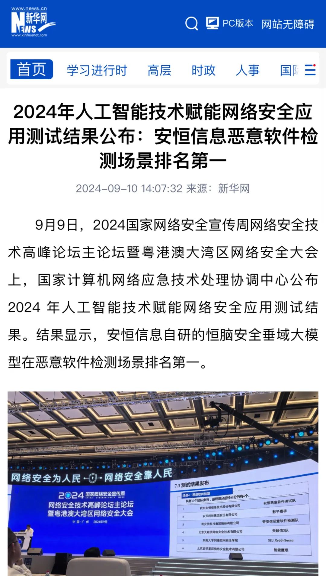 新华社、环球网、科技日报、中国青年报:2024年人工智能技术赋能网络安全应用测试结果公布,安恒信息恒脑安全垂域大模型在恶意软件检测场景排名第一。