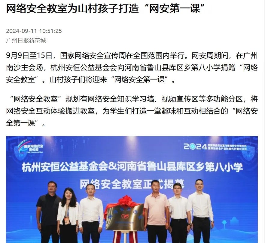 杭州安恒公益基金会“网络安全教室”捐赠仪式在网安周广州主会场举行,广州日报、新快报、深圳特区报、南方日报等报道。