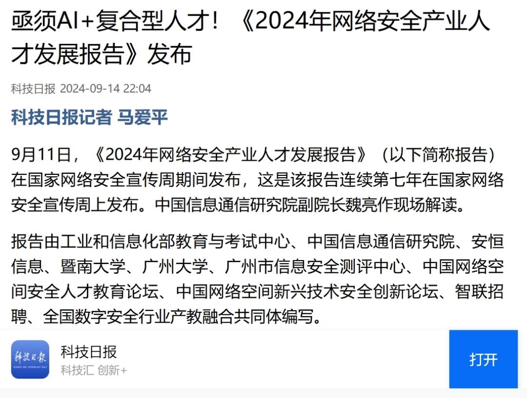 科技日报、光明网:《2024年网络安全产业人才发展报告》在国家网络安全宣传周期间发布,这是该报告连续第七年在网安周上发布。
