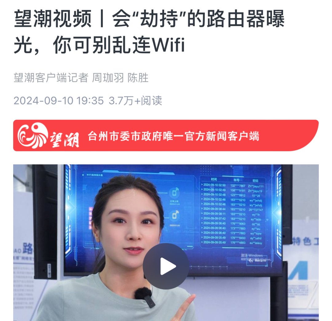 望潮视频报道,2024年浙江省网络安全宣传周期间,望潮视频记者参观安恒信息互动展位,体验“劫持”路由器,呼吁用户平时不可轻易链接公共Wifi。