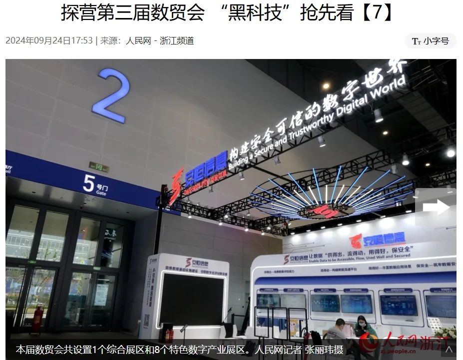 人民网、浙江在线报道,第三届全球数字贸易博览会在杭州拉开帷幕,来自全国各地的记者率先探营,现场体验本届数贸会安恒信息新科技。