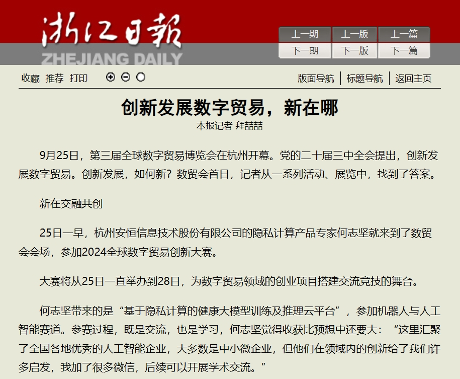 数贸会期间,安恒信息参加2024全球数字贸易创新大赛。浙江日报采访安恒信息隐私计算产品专家何志坚。