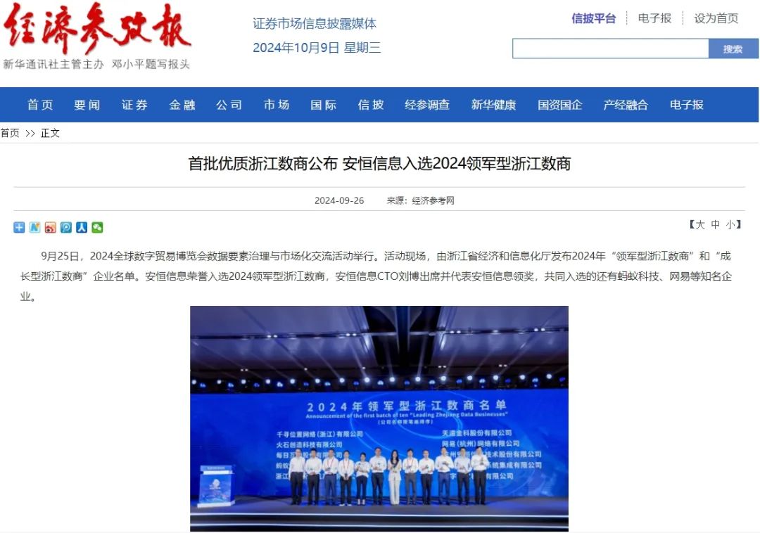 工人日报、光明网、经济参考报:2024全球数贸会发布2024年“领军型浙江数商”和“成长型浙江数商”企业名单,安恒信息入选2024领军型浙江数商。