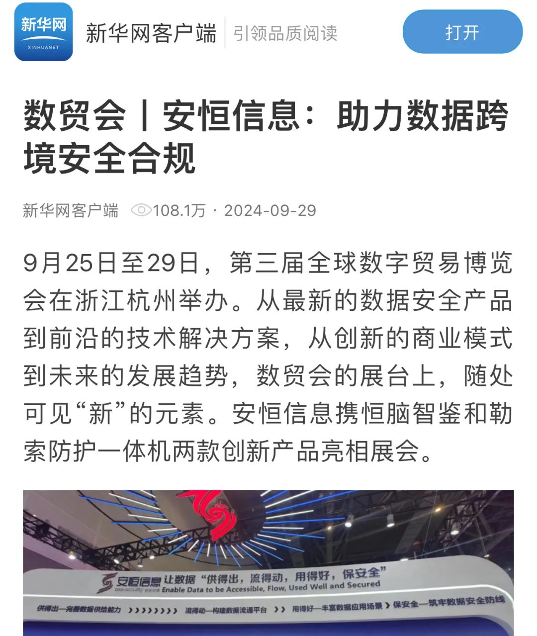 新华网报道,第三届全球数字贸易博览会在浙江杭州举办,安恒信息携恒脑智鉴和勒索防护一体机两款创新产品亮相展会。