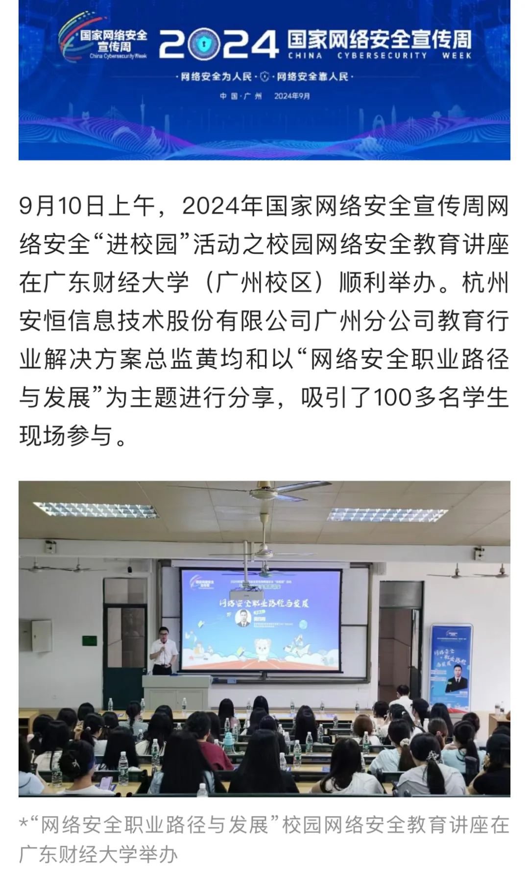 南方都市报报道,2024年网安周网络安全“进校园”活动,安恒信息广州分公司教育行业解决方案总监黄均现场分享安全教育讲座。