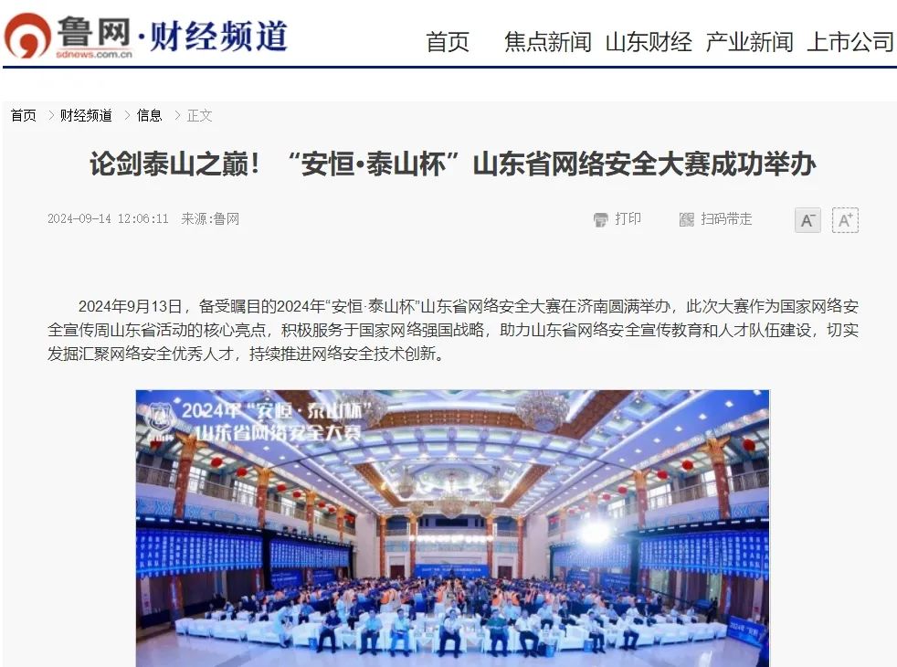 鲁网、山东在线、搜狐报道,9月13日“安恒·泰山杯”山东省网络安全大赛在济南圆满举办,比赛由安恒信息提供技术支持,安恒信息高级副总裁芦健现场发言。