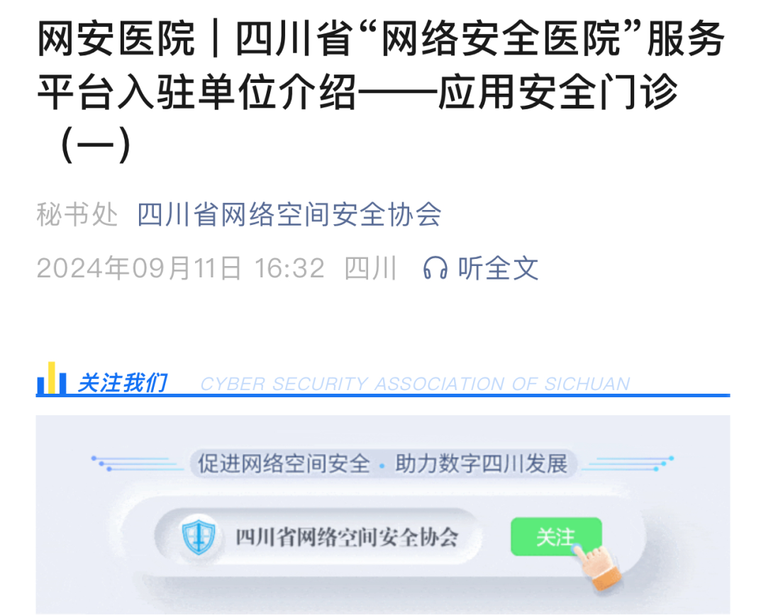四川省网络空间安全协会发布四川省“网络安全医院”服务平台入驻单位介绍——应用安全门诊,安恒信息入选。