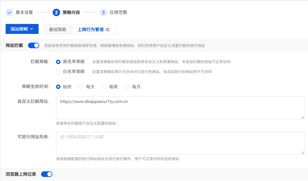 安恒办公智盾可根据实际情况配置安全防护策略,对淫秽色情、网络赌博等有害网站进行拦截,同时可配置自定义拦截网站,对指定网站进行拦截。