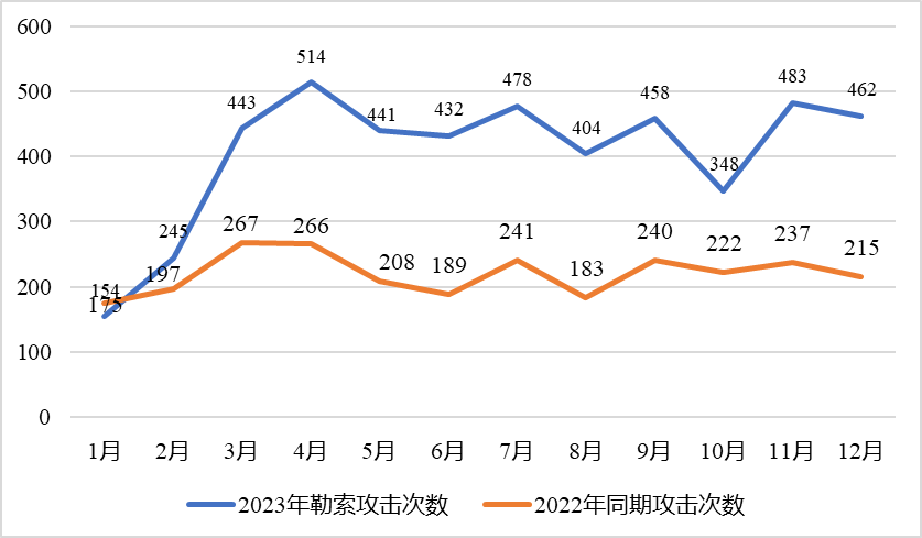 随着网络安全态势的加剧,勒索攻击、感染型病毒等恶性网络安全事件频发,对全球范围内的组织和个人造成了巨大损失,其中勒索攻击的发展速度与影响尤为显著,2023年全球勒索软件攻击次数较同期大幅增长。此外,勒索软件即服务(RaaS)模式的兴起,使得勒索非法产业链愈发完善,使得勒索攻击变得更加普遍。