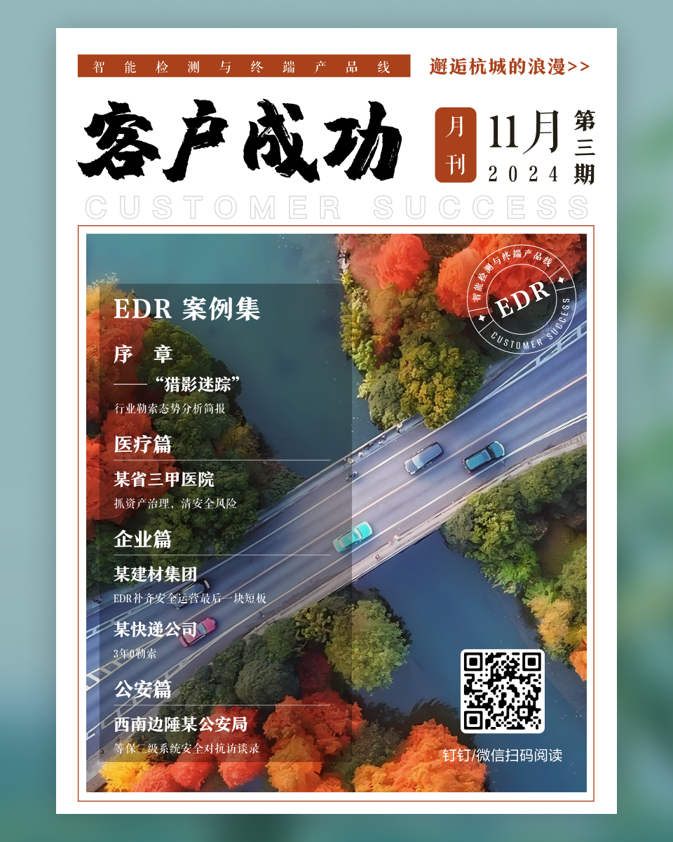 安恒明御终端安全及防病毒系统(以下简称“安恒EDR”)自发布进入市场以来始终秉持“客户成功”使命,持续打磨产品质量,具备专业的勒索防护能力,为各区域各行业用户提供可靠的终端安全保障。