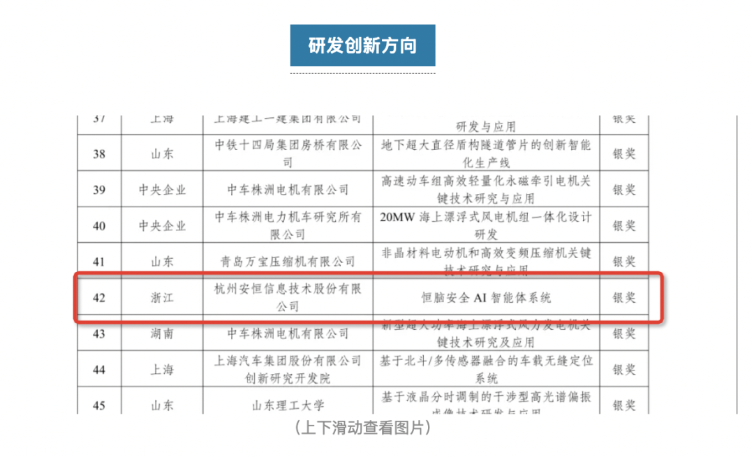 人才培养服务>近日,安恒信息恒脑安全AI智能体系统在第十八届 “振兴杯” 全国青年职业技能大赛职工组创新创效竞赛中荣获研发创新方向银奖,充分展现了恒脑非凡的实力和卓越的创新能力,标志着其在AI+安全领域的研发与应用水平已达到较高水准。安恒信息作为获奖的唯一一家网安企业,再次以其行业领先的智能化探索和全方位实践脱颖而出,获得肯定。