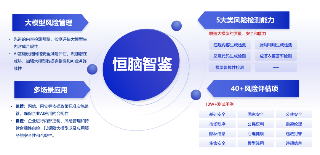 安恒信息始终致力于推动AI技术的健康发展,旗下恒脑智鉴产品是一套专为评估和缓解大模型在数据处理、模型构建和应用部署中的风险而设计的风险管理平台。结合先进的内容检测引擎,帮助客户检测大模型生成内容风险,保障信息输出遵守法律法规,维护企业品牌形象和避免法律风险。此外,系统还深入评估AI基础设施的网络安全风险,识别潜在威胁,加强客户的大模型数据完整性和AI业务连续性。