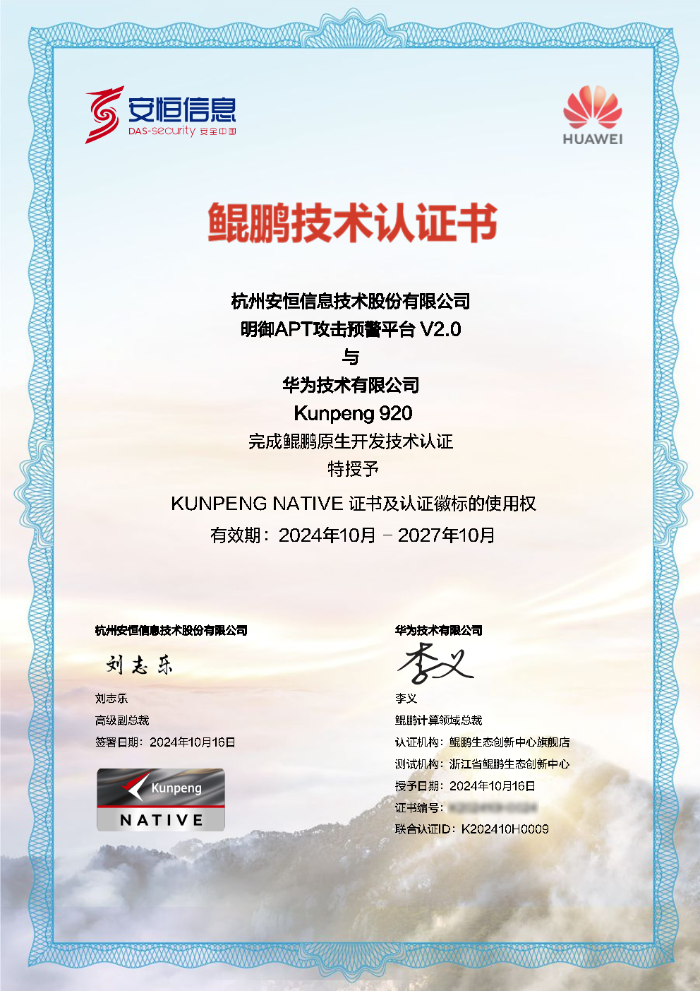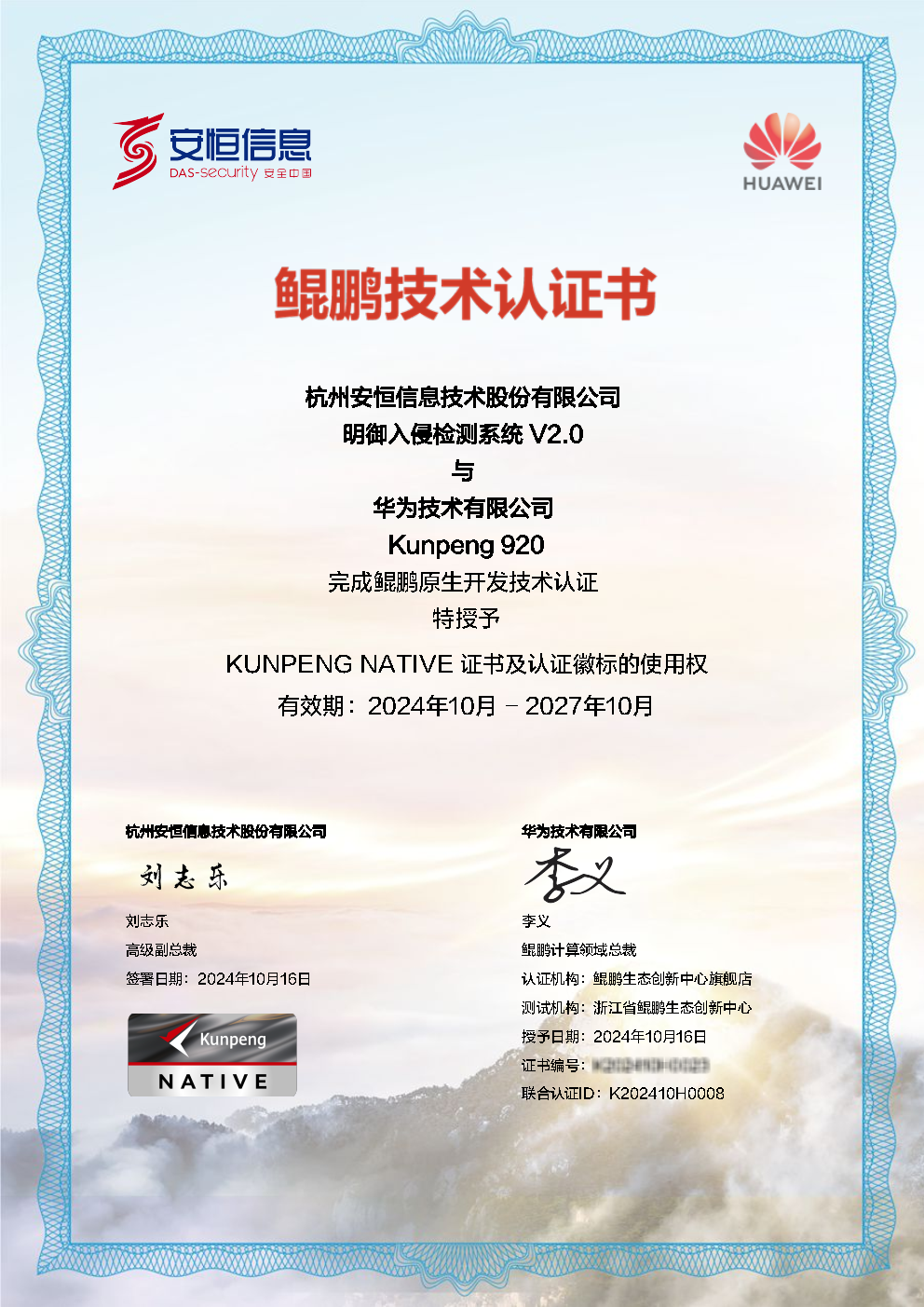 安恒信息作为国内领先的数字安全公司之一,专注于为政企行业提供全面的网络安全解决方案,致力于保护用户的网络资产和数据安全。考虑到鲲鹏平台具备高性能、低功耗、高安全、多核并行计算能力,同时提供全面的生态工具便于优化和迁移,2024年以来,安恒信息携手鲲鹏共同开启安全领域应用的原生开发创新,包括明御APT攻击预警平台、明御入侵检测系统、安全岛隐私计算平台、AiLPHA安全分析与管理平台在内的四款核心软件目前已经完成了原生开发,并获得Kunpeng NATIVE认证。
