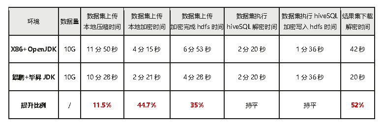 通过上述一些列优化,安全岛隐私计算平台数据集综合性能平均提升23.9%,其中:hiveSQL任务执行效率提升33.33%;数据集上传本地压缩效率提升11.96%;数据集上传本地加密效率提升44.12%;结果集下载解密效率提升53.75%,