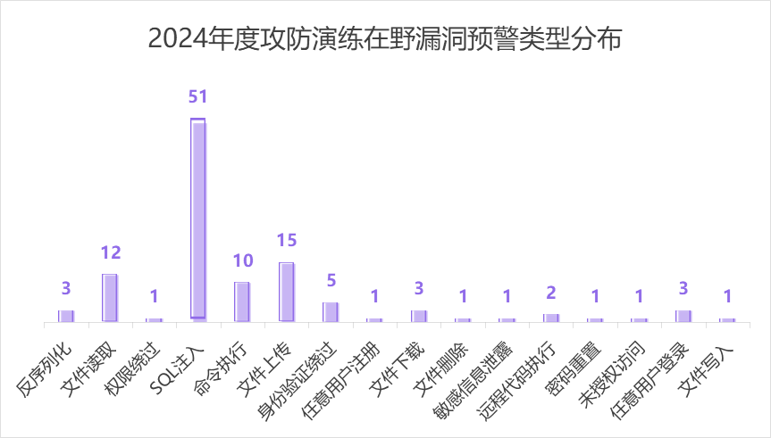 2024年攻防演练期间,安恒信息CERT对在野漏洞进行了全面监测,新增在野漏洞档案共计227条,其中一级漏洞档案114条,二级漏洞档案111条,经研判后,累计对111个漏洞发布漏洞预警,报告基于上述数据整理了2024年度攻防演练期间常见的漏洞类型分布概况。