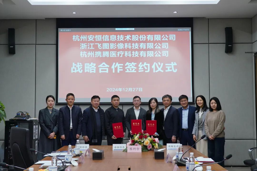 近日,安恒信息与浙江飞图影像科技有限公司(以下简称“飞图影像”)、杭州携腾医疗科技有限公司(携腾医疗)签署战略合作协议,三方将聚焦医疗行业,围绕能力融合、技术创新、业务协同等领域开展合作。