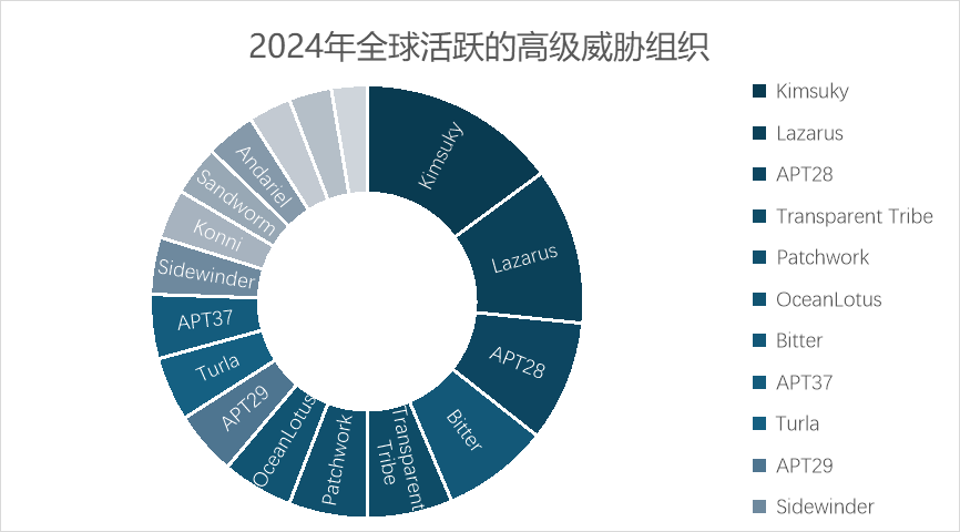 2024年,全球高级威胁(APT)活动呈现出新的态势,尽管新披露的APT组织数量有所减少,但老牌威胁组织的活动更加频繁且技术水平显著提升。其中,排名靠前的APT组织如 Kimsuky、Lazarus、APT28、APT36、Patchwork、OceanLotus 以及 Bitter,依旧在多个地区开展密集的网络攻击行动。