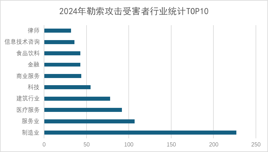 制造业继续成为受勒索软件攻击威胁最严重的行业,原因在于其复杂的供应链和高度依赖运营的工业设备,一旦被攻击将导致严重的经济损失。其次,服务业和医疗健康领域也面临着较高的风险,尤其是医疗健康领域,因其敏感数据和业务连续性需求,成为增长最快的攻击目标领域。