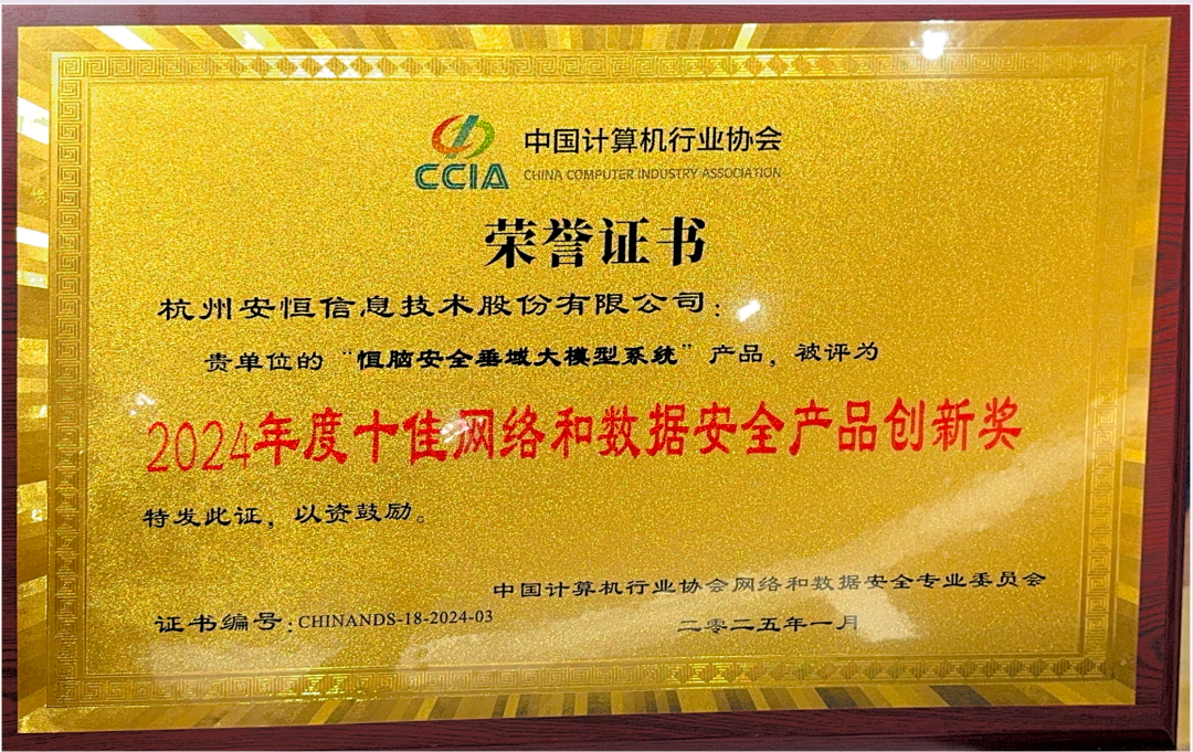 此次,安恒信息 “恒脑安全垂域大模型系统” 荣获 2024 年度十佳网络和数据安全产品创新奖,代表了恒脑在业内领先的实力。此前,《中国安全大模型技术与应用研究报告(2023)》指出,安恒信息在业内处于领先地位。恒脑曾首批通过中国信通院组织的“面向大模型的增强型可信执行环境基础能力专项测试”,被中国软件测评中心授予“大模型安全服务能力评定资格证书”,入选“磐石·Y”大模型安全实践优秀案例等。在2024年国家网络安全宣传周上,国家计算机网络应急技术处理协调中心公布 2024 年人工智能技术赋能网络安全应用测试结果。结果显示,安恒信息自研的恒脑·安全垂域大模型在恶意软件检测场景排名第一。