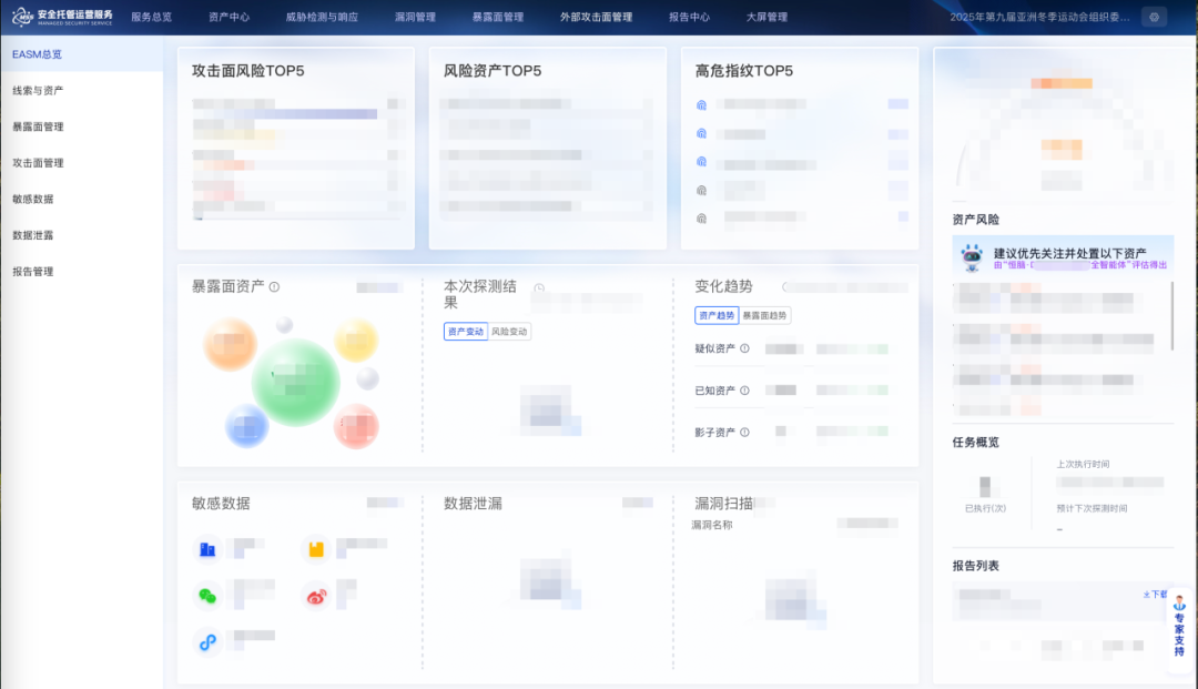 在亚冬会的筹备阶段,网络安全的备战工作就已经紧锣密鼓地展开。安恒信息MSS 团队深知,要确保赛事期间网络的绝对安全,首先要对所有数字资产进行全面清查与潜在风险加固防护。此时,基于恒脑・AI 版智能体的MSS-EASM(外部攻击面管理服务),就如同数字世界的 “清道夫”,发挥了关键作用。