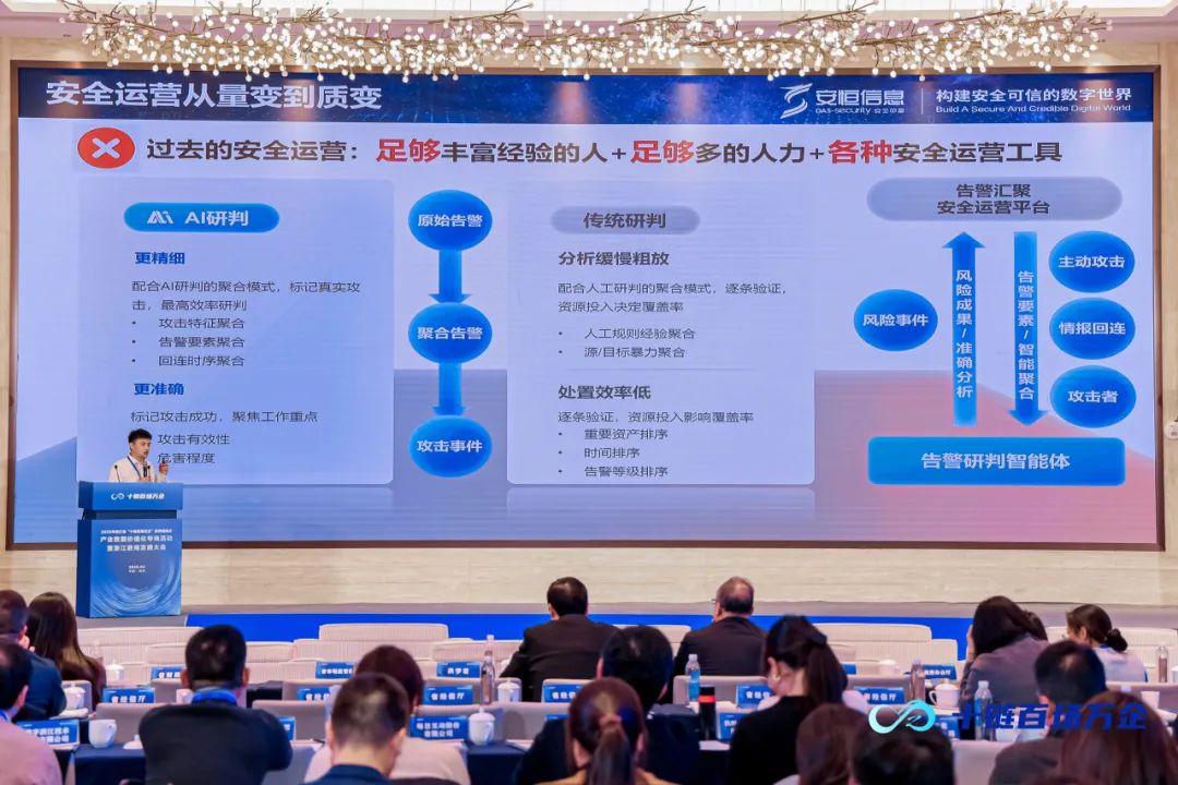 在人工智能技术的加持下,数字安全也迎来了全新升级。安全运营方面,通过恒脑智能体实现告警降噪、AI研判联动SOAR使响应时效缩短86%,并构建个性化智能体降低人工工时;数据安全方面,AI分类分级速度提升30倍(日均处理量从1500字段增至10万字段),已落地近百个项目覆盖多行业;数据资产方面,AI原生可信数由空间解决"供不出-流不动-用不好"难题,通过数据可信空间,实现“数据既要保护,又要利用”。