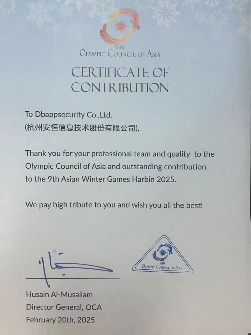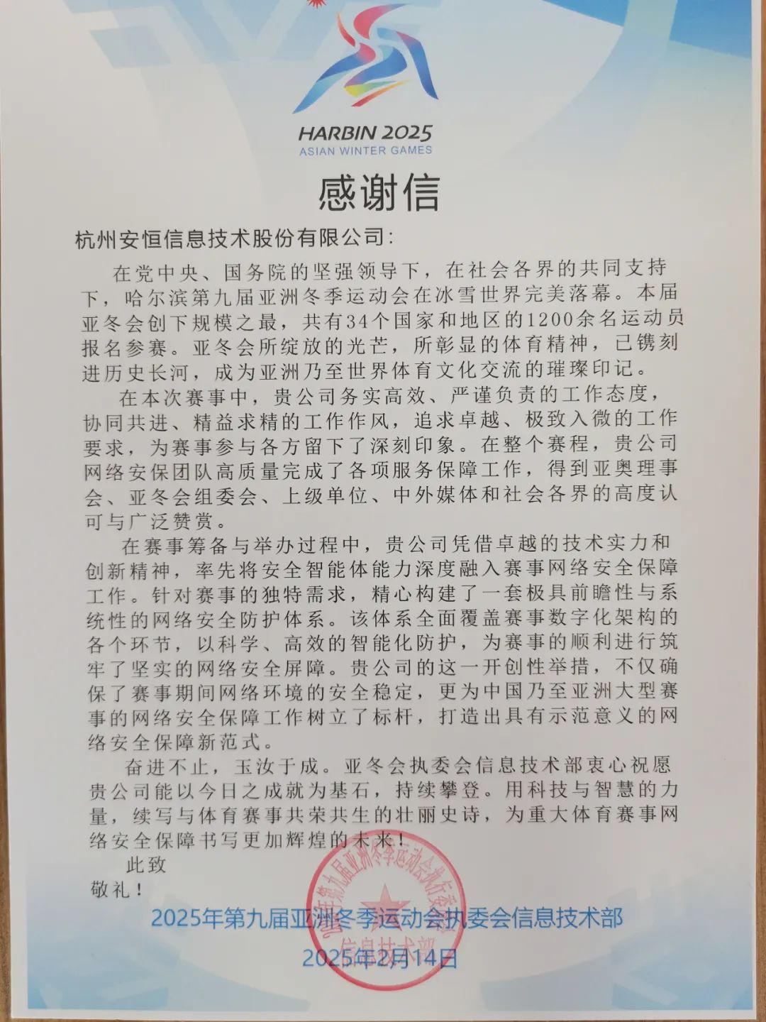 近日,安恒信息收到了来自亚洲奥林匹克理事会(OCA)及 2025 年第九届亚洲冬季运动会执委会信息技术部发来的官方感谢信,对安恒信息作为赛事官方网络安全和数据安全赞助商在 2024 年哈尔滨亚冬会期间提供的全方位安全保障服务给予高度肯定。