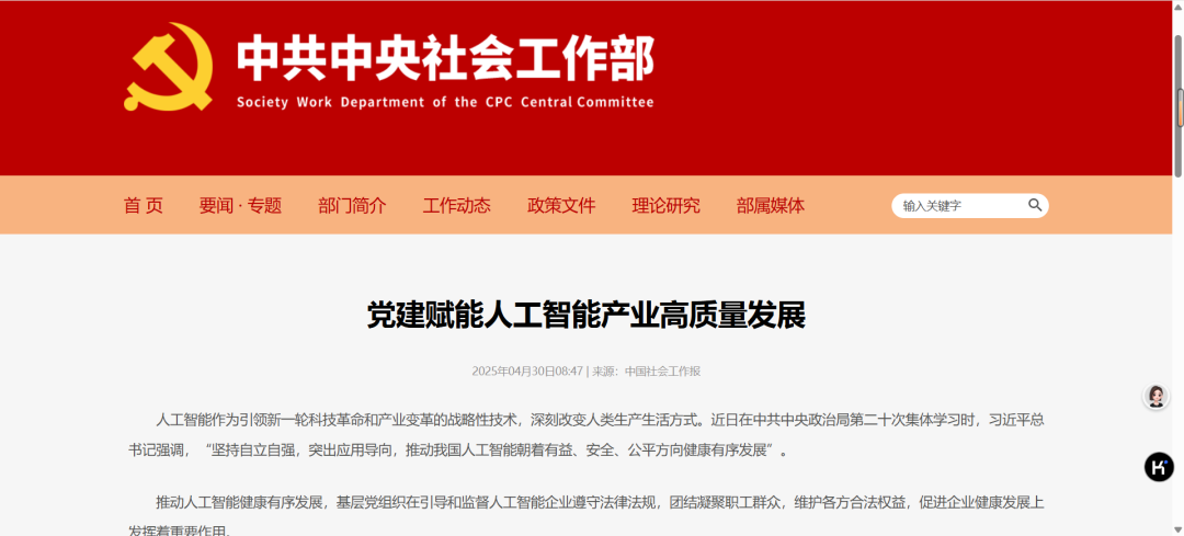 近日,中国社会工作报刊登了《党建赋能人工智能产业高质量发展》主题文章,文内介绍到安恒信息作为数字安全企业,如何将党建赋能于企业经营与发展,并得到中共中央社会工作部官网的转发——
