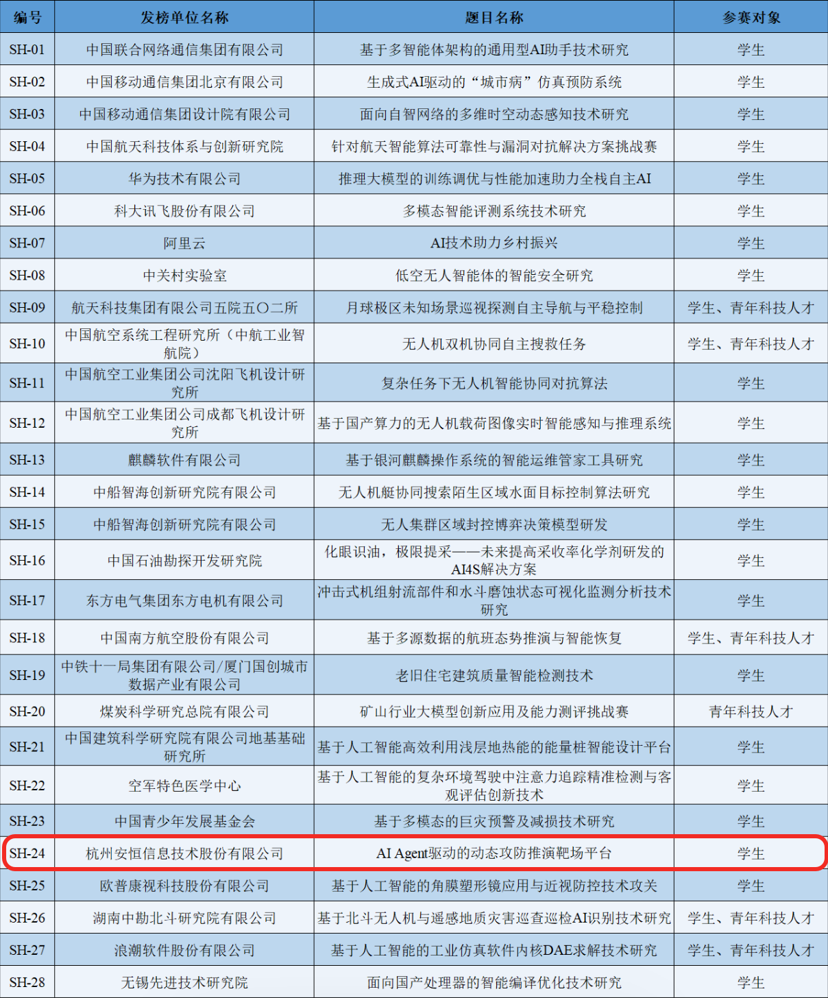 去年,安恒信息联合命题就已入选挑战杯2024年度“揭榜挂帅”专项赛,吸引了国内众多高校的踊跃参与。今年,安恒信息申报的命题再次入选!本年度安恒信息命题紧贴大赛创新创造的技术理念,聚焦人工智能安全应用领域,鼓励高校学生积极进行技术创新。