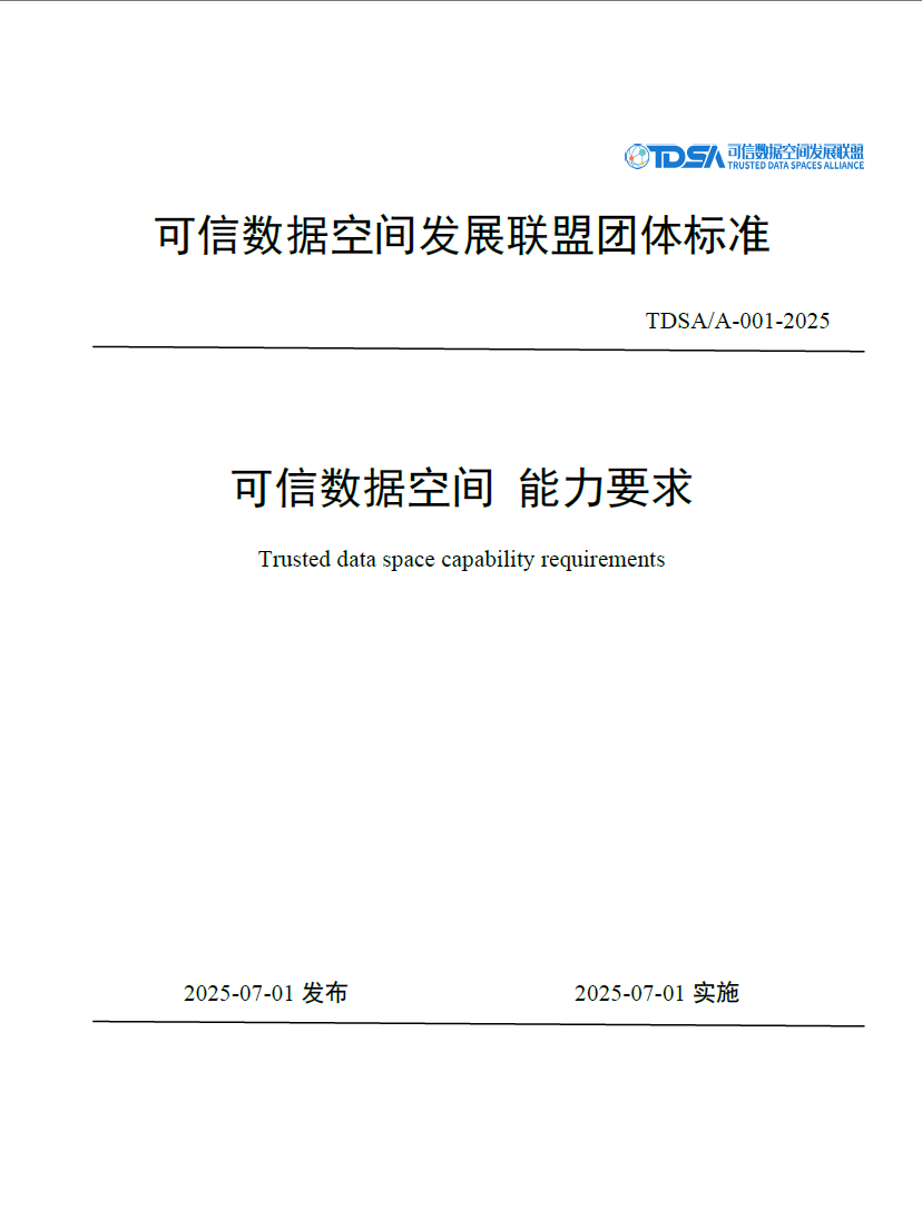 由可信数据空间发展联盟(TDSA)组织制定的团体标准TDSA/A-001-2025《可信数据空间 能力要求》于7月1日正式发布实施。
