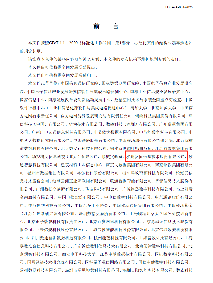 安恒信息作为最早参与数据基础设施建设的数字安全企业,在为各行各业提供高质量创新产品与服务的同时,一直积极参与可信数据空间相关标准的研究与制定工作。