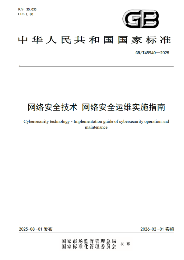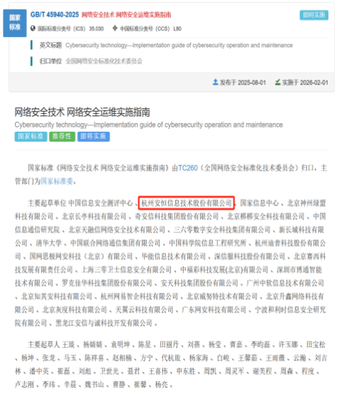 2025年8月1日,国家标准化管理委员会发布2025年第19号中国国家标准公告,国家标准GB/T 45940-2025《网络安全技术 网络安全运维实施指南》正式获批发布,将于2026年2月1日正式实施。安恒信息作为网络安全运维实施指南国家标准的核心主笔起草单位和试点应用推广牵头单位,全方位深度参与该国家标准的研究制定和试点验证工作。GB/T 45940-2025的发布实施,对全面、系统地指导网络安全运维工作,提升网络安全防护水平,规范和促进网络安全运维技术与服务产业发展,具有重要意义。