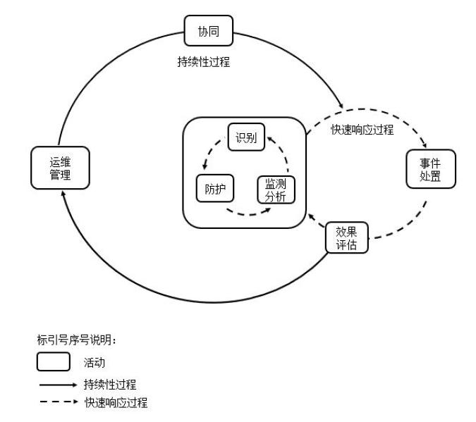 《实施指南》国标提出完整的网络安全运维实施流程,如图2所示。运维管理对网络安全运维的整体活动进行规划和管理,考虑组织网络安全长期改进需要做出的决策和进行的投入,提出网络安全运维整体方案;协同指通过网络安全运维活动相关方组织内外部的协调与协作,通过威胁信息共享、供应链安全管理等活动以提高网络安全运维的效能与安全防护水平,运维管理和协同是针对网络安全风险防范的常态化长期活动,在网络安全运维活动中作为一个持续性过程。识别、防护、监测分析和事件处置四个环节是针对网络安全事件进行响应和处置的应急性活动,在网络安全运维活动中作为一个快速响应过程。效果评估是在网络安全运维过程中,基于SLA对运维实际效果进行评估,根据效果评估情况进一步改进网络安全运维的管理和实施水平。