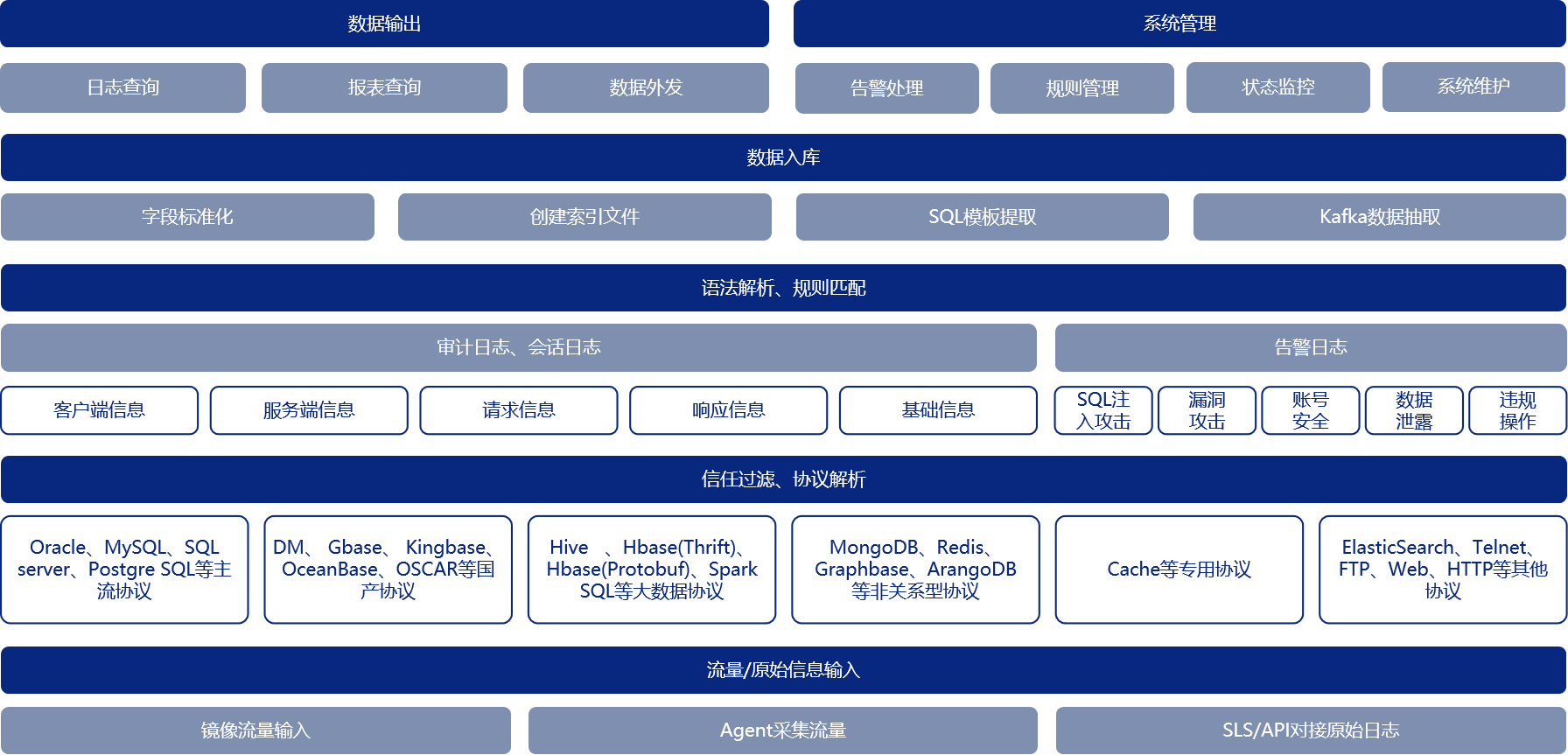 审计准确率可达99.9999%(经运营商集采测试验证):每秒最高入库 13 万条审计日志,单Agent转发速率800Mbps,支持审计客户端工具、主机名、操作系统用户名、执行人、数据库名等信息。