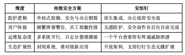 首创“平台+安全”深度整合范式,结合钉钉亿级日活场景+安恒18年国家级重保零事故攻防体系,构筑安全能力天然载体,推动终端安全从工具向能力进化