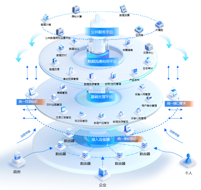 为此,安恒信息推出数由空间——一种灵活、可扩展的可信数据空间框架与实现,能以低成本、高效的方式实现与多种数据流通利用设施的融合联通。数由空间由接入点数由器、基础支撑平台、流通利用平台三个层面构成,再辅以动态安全防护以及统一的对接服务。