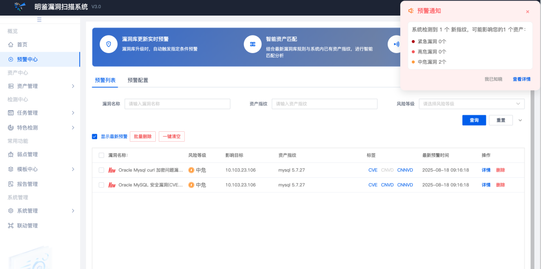 “试试这个。”IT 总监老张抱着笔记本电脑走进来,拍了拍老李肩膀,屏幕上是明鉴漏扫的新界面。“昨晚的事我在群里看到了,这是安恒在上月护网期间发布的新版本,无感扫描、漏洞预警我们很需要。我配好资产信息了,你试试。”
