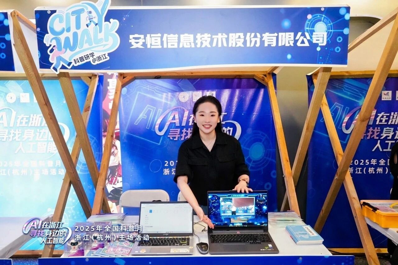 主场活动期间,热闹新潮的“SciLuck科普长桌”也在西湖区文三数字生活街区惊艳亮相!安恒信息现场设置互动展位,带来AI反诈秘籍、隐私保护三件套等实用科普礼品。同时有趣的AI换脸互动体验吸引了不少观众驻足:借助先进的人脸识别与实时图像合成技术,体验者可轻松将自己的面部表情映射到虚拟角色上,生动展示了人工智能在数字身份识别与安全防护中的前沿应用。