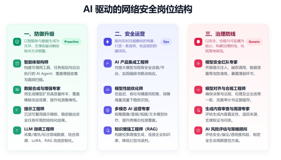 智联招聘平台数据显示,2025年网络安全运营类岗位以26.8%的占比连续三年排名第一;企业最青睐“3-5年经验+实战能力”候选人,其中,要求3-5年经验的占比28.2%,工作经验和实战能力分别占比76.2%与72.2%。AI工具使用与调优(48.8%)、对抗性AI攻防(47.7%)已取代传统渗透测试,成为从业者“最想补的短”。56.5%的受访人表示“AI把重心推向复杂威胁分析”。因此,人机协同正在重构岗位职责。