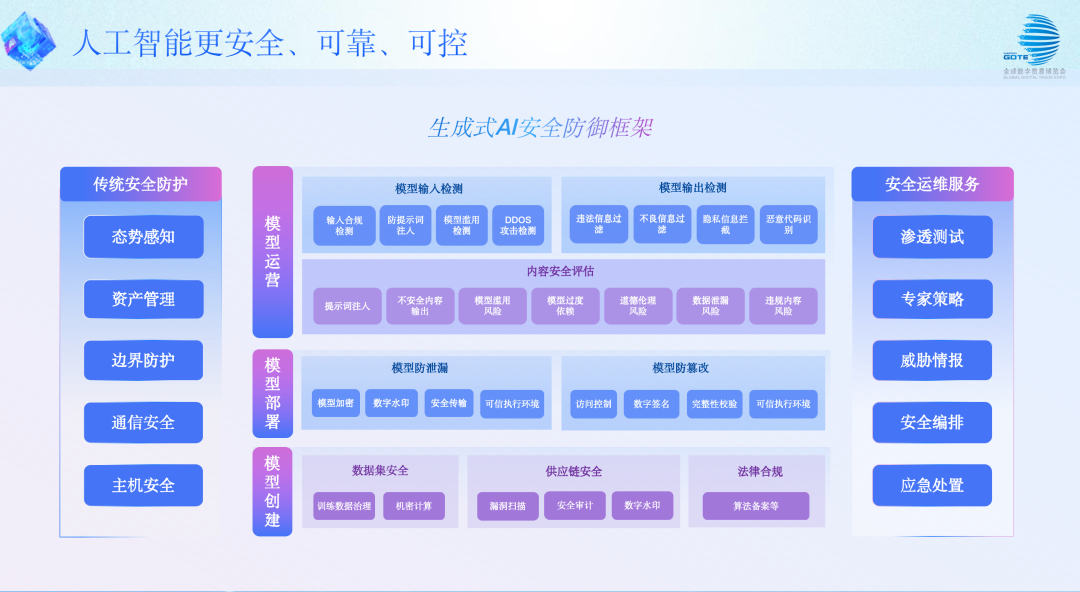 在关注AI 赋能安全的同时,范渊也强调需高度重视AI带来的安全风险:“我们应该在AI基础设施建设之初,就考虑全方位、全生命周期的安全设计。安恒信息构建生成式AI防御框架,让人工智能更安全、可靠、可控。”