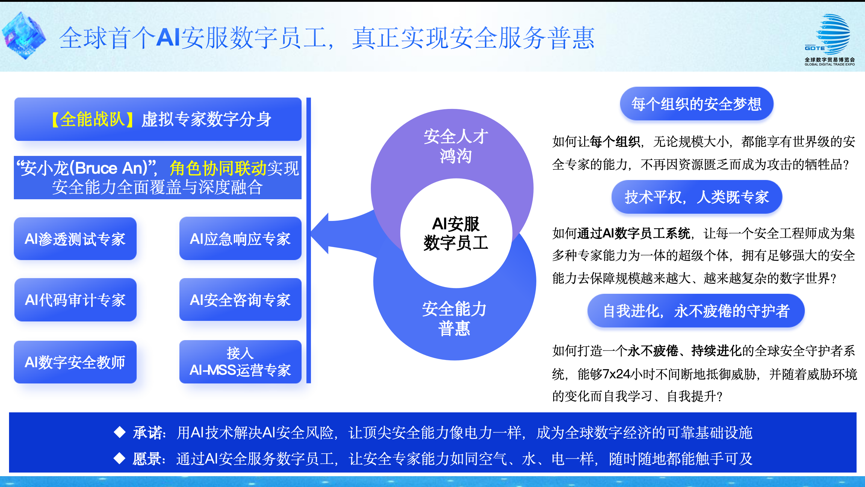 范渊介绍道,在25日晚数贸之夜活动中,全球首个AI安服数字员工——“安小龙”正式发布,可实现7×24小时在岗,彻底改变了传统安全服务的格局——过去,安全服务常是大企业拥有的“奢侈品”,而AI安服数字员工真正实现了“让中小企业用得起、大企业用得精”。更重要的是:“这不是替代人类专家,而是让专家的能力‘裂变式复制’,让顶尖安全专家能力像电力一样,成为全球数字经济的可靠基础设施”。