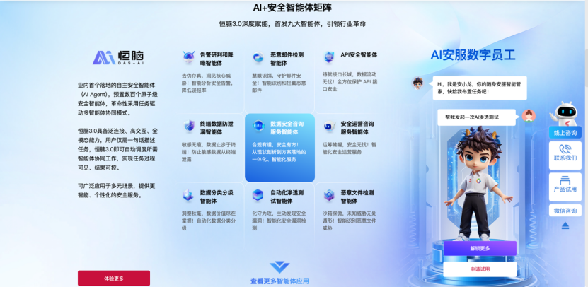 A即AI-人工智能:国内首个AI安全智能体——恒脑3.0,强势推动“让安全更智能让智能更安全”。