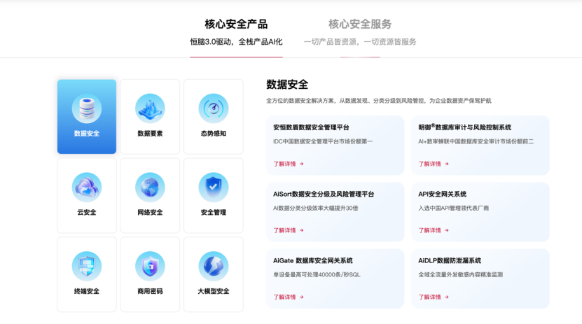 准:导航栏按“AI + 安全产品”“AI + 安全服务”“行业解决方案” 分类,点击即可精准定位;