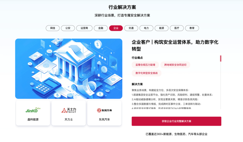 此次官网升级,旨在打破这些障碍:把抽象的“AI + 安全” 能力,变成你能一眼看懂的场景方案;把复杂的产品服务,梳理成清晰的查找路径;把繁琐的操作流程,简化成 “一键直达” 的便捷体验,让每一位用户都能轻松对接安全需求。