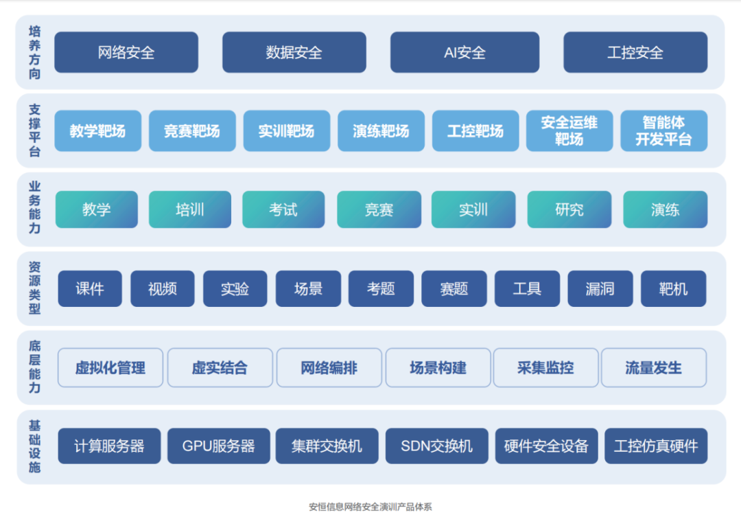 《实战网络靶场应用指南(2025版)》指出,当前企业建设靶场普遍面临“为合规而建、难见实效”的困境。而安恒信息依托多年网络安全人才教育经验,提出的七大核心靶场平台,打造了覆盖“学习—训练—考核—对抗—复盘—优化”全生命周期的演训体系,真正实现从“建靶场”到“用靶场”的价值跃迁。
