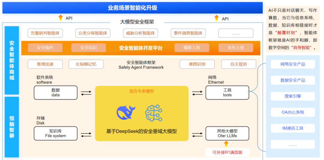 在“AI攻击时代”加速到来的背景下,安恒信息率先将恒脑安全垂域大模型与靶场深度融合,“恒脑安全垂域大模型”是安恒信息在网络安全领域深耕16年的智慧结晶,依托深厚的行业积累与技术沉淀,融合百名资深安全专家的经验、千名研发工程师的技术实践、数十万份真实安全事件的处置报告,以及为超百万人次提供专业培训所形成的海量知识体系,构建而成的国内领先的网络安全垂直领域大语言模型。该模型不仅具备强大的自然语言理解与生成能力,更深度内化了网络安全领域的专业知识、攻防逻辑与实战方法论,能够精准理解复杂安全问题,提供专业级分析与建议。