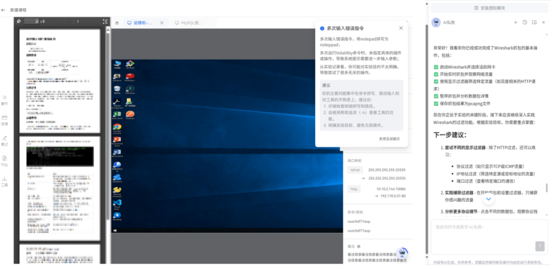 正如报告所强调:“AI不仅是工具,更是靶场智能化的核心引擎。” 基于“恒脑安全垂域大模型”的强大能力,我们打造了“恒脑垂域一体机+靶场”的智能化网络安全人才培养解决方案。该方案以“AI私教”为核心理念,全面重构传统教学与实训模式,推出全局智能问答、课程自动生成、实验过程智能辅助、赛题智能推荐与动态调整等一系列创新功能,实现从“经验驱动”向“智能驱动”的跨越。