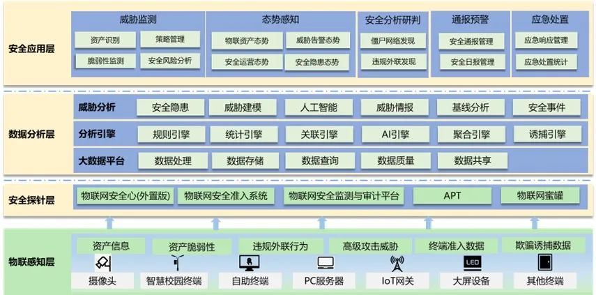 面向高校智慧物联网应用场景,以保护学校物联网资产与网络为目标,以物联网安全感知与管理平台为核心,结合不同维度的安全探针,构建高校智慧物联网络整体安全防护体系。技术构架分为如下四个层级: