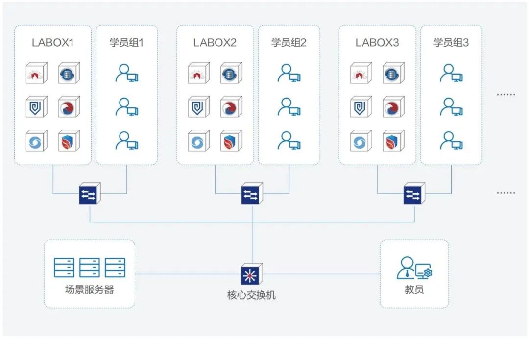 实验室以组为单位,每组由LABOX加信息安全硬件产品组成的形式进行部署,在不需要改变现有网络架构的前提下,接入到指定区域网络,通过WEB界面图细化方式配置快速接入。